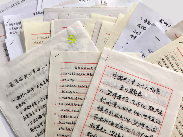 為進一步加深黨員職工對黨的二十大報告的學習理解,推進黨的二十大精神進頭腦、進思想,2022年11月26日至12月10日,公司黨委組織開展“最感奮我的黨的二十大報告金句”推薦活動。 通知一經下發,雖處疫情居家辦公期間,但大家的積極性絲毫不受影響。公司領導班子成員率先垂范,結合參加國務院國資委培訓中心學習貫徹黨的二十大精神網絡培訓班學習收獲,原原本本學習黨的二十大報告原文,共推薦金句112條。黨員職工認真學習黨的二十大報告,深刻理解報告中的新論斷、新要求、新部署,懷著崇敬的心情,一字一句工整地抄寫著金句,并表示,作為國企職工,要深入學習貫徹黨的二十大精神,立足本職、積極工作。十分公司王帥表示,通過摘抄黨的二十大報告金句,又是一次原原本本學習,通過抄寫,對報告內容又有新理解、新收獲,中國共產黨為人民謀幸福,從來都是動真情、出實招、辦實事?!白鳛橐幻h員,要當好干事先鋒員,以奮發有為的姿態抓工作落實。對照黨的二十大的法治要求,響應黨的二十大的號召,我們要做社會主義法治的自覺遵守者、堅定捍衛者?!绷止緞⑸f。五分公司丁江霞更是在認真抄寫黨的二十大報告原文的同時,把自己朗誦的黨的二十大報告金句錄制下來,發送到自己的社交平臺,讓更多的人投身到黨的二十大報告學習中來。 本次活動,每名黨員職工分段分條推薦并把黨的二十大報告中讓自己最受感動、最受啟迪、最受鼓舞、最受激勵的原文,用筆抄寫到紙上,每人最少10條,不設上限。用腦思考、用手抄,手腦并用,學習更高效。經統計,共計523名黨員職工參與,累計推薦金句5530條,最終公司黨委擇優評選出19個作品給予表彰獎勵。(黨委宣傳部)