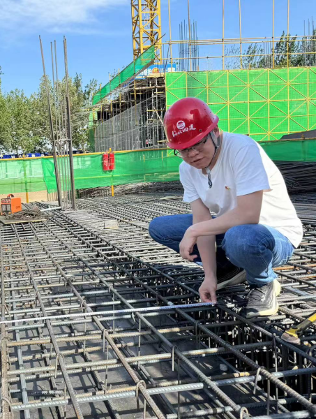 在搶抓進度的同時,史驚濤深知質(zhì)量是項目的生命線。他帶領(lǐng)團隊狠抓質(zhì)量控制,實現(xiàn)過程精品、一次成優(yōu),定期召開“質(zhì)量分析會+作業(yè)面交底會”,嚴(yán)控每一個環(huán)節(jié)、精研每一道工序,尤其是在地下室施工鋼筋綁扎階段,鋼筋間距密、數(shù)量多,柱插筋、集水坑鋼筋要求位置精確,施工難度較大,他認(rèn)真分析質(zhì)量控制重點和難點,進行專項攻關(guān),結(jié)合現(xiàn)場實際情況反復(fù)推敲施工方案,按照圖紙設(shè)計間距,在基礎(chǔ)墊層上彈好鋼筋位置線,綁扎時嚴(yán)格按照位置線進行柱插筋及集水坑鋼筋的放置及綁扎,墻筋采用水平和豎向定位筋,確保綁扎牢固,間距均勻,縱橫成線。