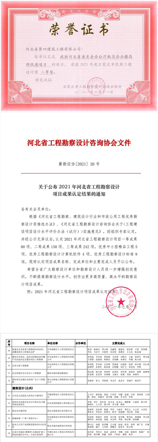 7月5日,公司設計院收到榮譽證書和文件,《政協河北省委員會辦公廳機關辦公樓局部改造項目》獲2021年石家莊市優秀工程設計獎二等獎、河北省工程勘察設計項目成果獎三等獎。