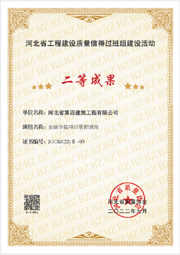 9月16日,六分公司收到了河北省質量協會頒發的證書,河北金融學院項目管控班組榮獲“河北省工程建設質量信得過班組建設活動”二等成果,并被推薦到中國建筑業協會交流。