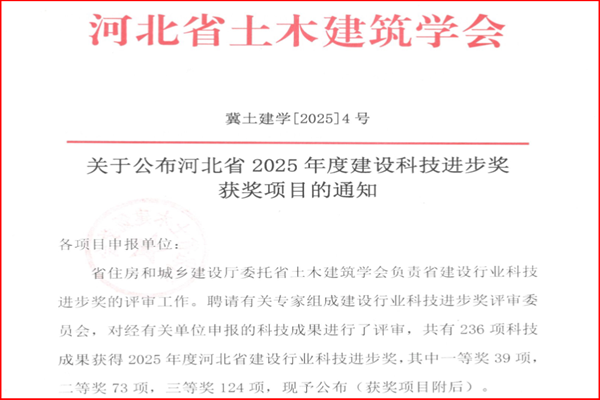 7月3日,河北省土木建筑學(xué)會公布了2025年度河北省建設(shè)科技進(jìn)步獎名單。公司憑借扎實(shí)的科技創(chuàng)新與技術(shù)攻關(guān)能力,一舉斬獲16項科技成果獎項,其中,一等獎1項、二等獎4項、三等獎11項。
