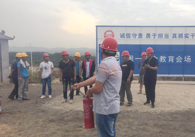 項目部即將進行墊層混凝土澆筑施工,現場有大量的木模板、油漆等易燃品,正值高溫季節,火災隱患較大。項目部結合現場實際組織了本次消防演練,演練分為消防知識培訓和火災事故演練兩部分。演練前項目經理李宏偉通報了溫嶺槽罐車爆炸事故造成的嚴重后果,闡明本次演練的目的和意義。隨后項目部安全員王東春對滅火常識、火災逃生方法、滅火器如何使用等進行了講解,并演示了手提式干粉滅火器的具體使用方法,參與演練的人員親自體驗了滅火器的使用。