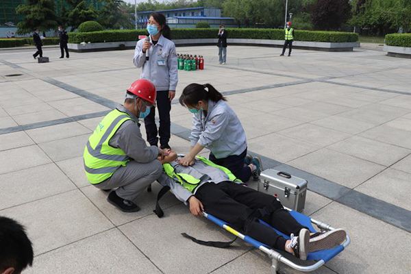 上午10點,消防救援支隊講解員對全體人員進行消防安全知識培訓,詳細講解了防煙面罩正確佩戴方法、疏散逃生要領,以及滅火器的使用方法和注意事項。10點半左右,演練正式開始,施工現場三區二層濃煙滾滾,“著火了,著火了¨¨¨”項目安全員在現場巡查時發現火情高聲呼喊,周圍施工人員迅速拿滅火器進行滅火,項目經理張玉賓接到險情后馬上通知義務消防隊員滅火并組織緊急疏散。大家用濕毛巾捂住口鼻,俯身低頭按照演練逃生路線快速從現場撤離到演練集合區。在大家撤離火災現場的同時,救援組孫杰、楊克、董擁軍等人把傷員抬到通風處,他們在醫療救護組的指導下,用雙手拍打傷者雙肩并呼叫他的名字、用觸摸頸動脈等方法斷傷者是否喪失意識,并進行心肺復蘇。心肺復蘇演練時,按壓胸部是最有效也是最常用的辦法,施救人員首先在傷者兩乳頭連線中間,胸骨中下三分之一處找準按壓點,然后用手掌根部緊貼傷者胸部,兩手重疊,五指相扣,手指翹起,肘關節伸直,用上身重量垂直下壓30次,經過救治傷者最終蘇醒,整個搶救過程有條不紊,最后藁城區消防救援大隊長張海寧對應急預案演練進行了點評,此次火災應急預案演練圓滿結束。
