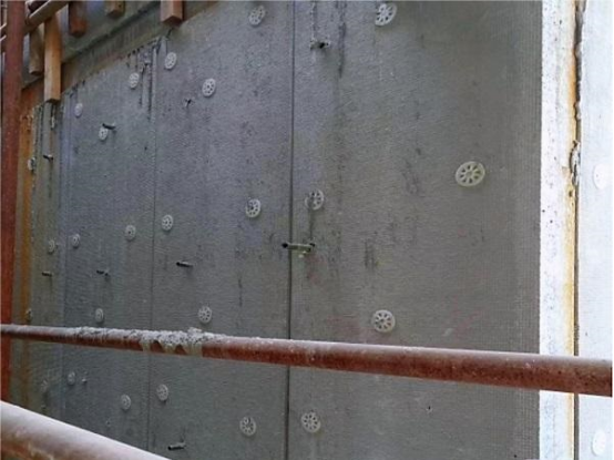 為此,項目部成立專門的課題實施小組,提出利用BIM技術繪制Revit模型,對復合保溫板進行統一建模排版、分拆、編號、加工制作,再采用“三合一”技術創新方法開展施工:一是基于3D打印技術,設計了一種帶卡槽結構的新型墊塊,來控制鋼筋混凝土保護層厚度,二是制作加固直板,確保復合保溫板陰陽角施工質量,三是采取螺栓孔洞內填充防水砂漿、保溫砂漿封堵等措施,不僅增強了墻體的性能,還提高了外墻防滲防漏水性能,共同形成了“FW-Ⅲ復合保溫板與模板一體化支設工藝”科研成果。